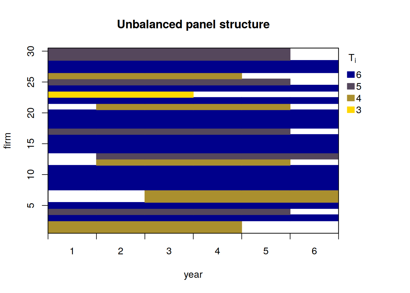 pdynmc::strucUPD.plot(unbalanced, i.name = "firm", t.name = "year")