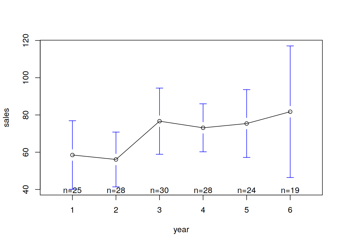 gplots::plotmeans(sales ~ year, production)